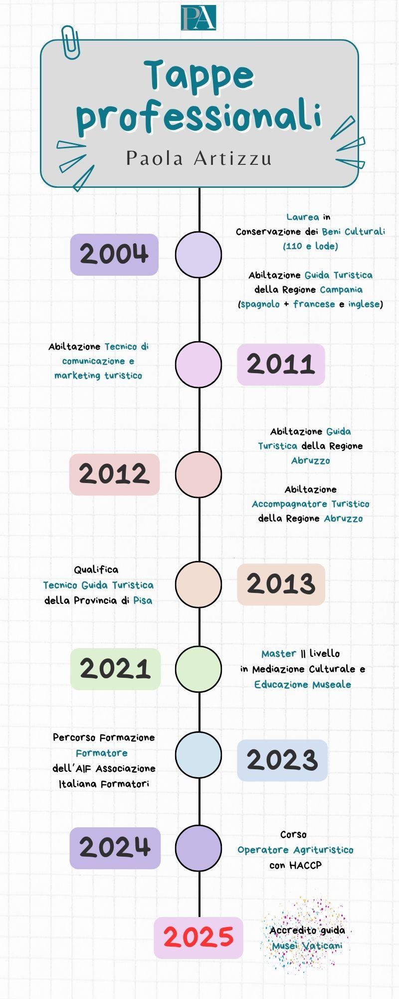 Lavoro nel settore della divulgazione del patrimonio dal 2000 ed esercito la professione di Guida turistica da quasi 20 anni: oggi principalmente in Lazio e Abruzzo, ma opero anche in Toscana e nel Campania. Ho lavorato a lungo con gruppi organizzati e scolaresche, tuttavia negli ultimi anni mi sono concentrata su visite private per famiglie e piccoli gruppi.